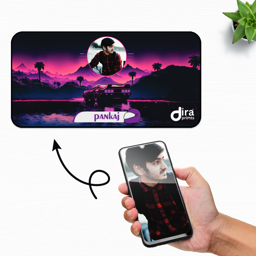 This mat is essential for fans of 80s nostalgia, cyberpunk art, and racing games. Sized generously to cover and protect your entire desktop, it provides a continuous, smooth surface essential for flawless mouse control. Customize it with your photo and name, like KARAN, to create a unique piece of retro desk décor that captures the spirit of the decade.