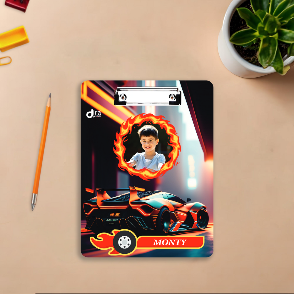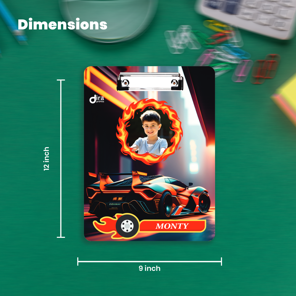 Ignite your child’s enthusiasm for study time with the thrilling Diraprints Personalized Exam Board! This writing pad is designed for young speed enthusiasts, featuring a high-octane sports car graphic set against a futuristic cityscape. The bold flames surrounding the photo and name (e.g., "MONTY") make this board impossible to forget!