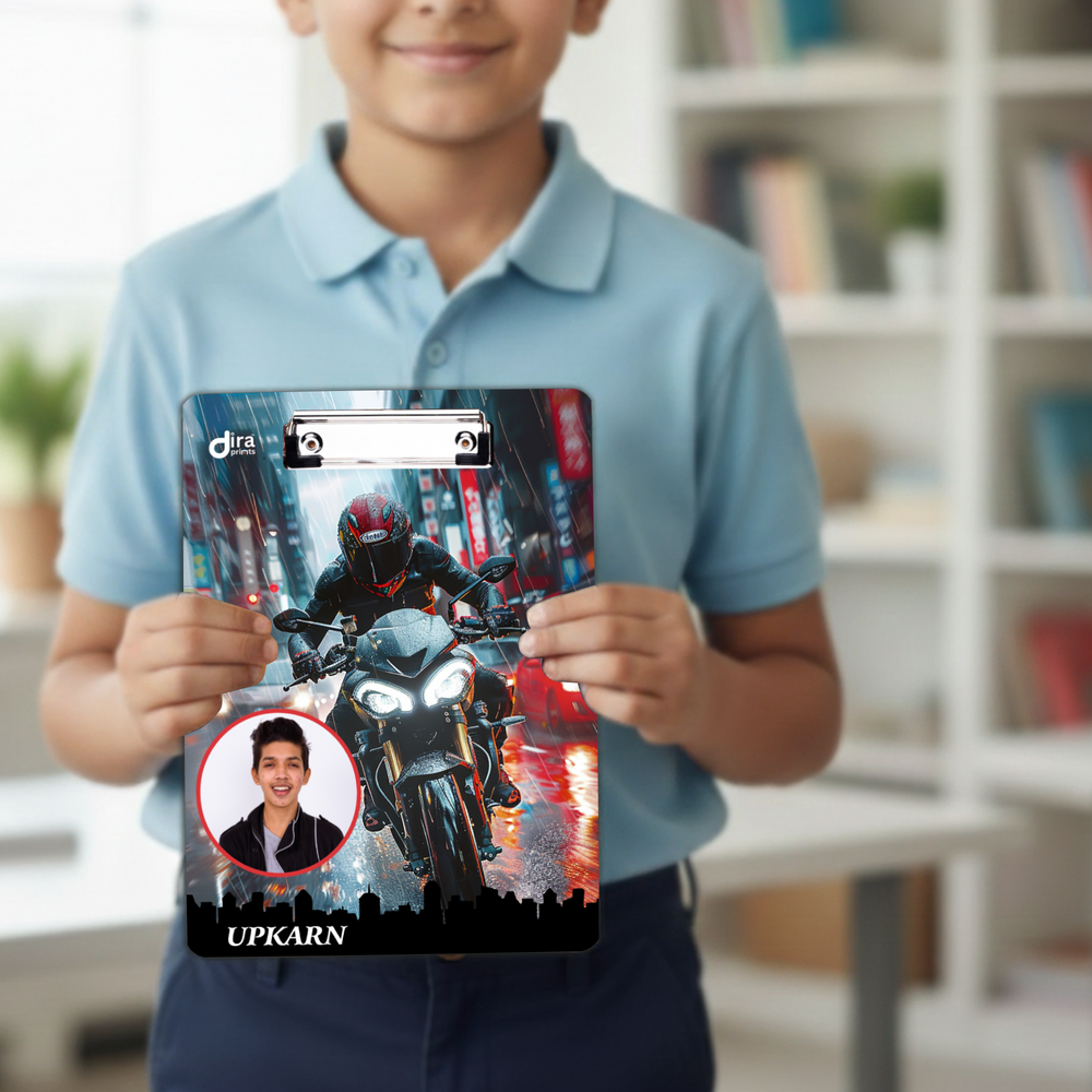 Take on your studies with the focus of a midnight rider with the Diraprints Personalized Urban Rider Exam Board! This writing pad is designed for students who love the adrenaline and aesthetic of street racing and powerful sports bikes. The high-quality graphic features a rider on a sleek motorcycle navigating a wet, neon-lit city street.