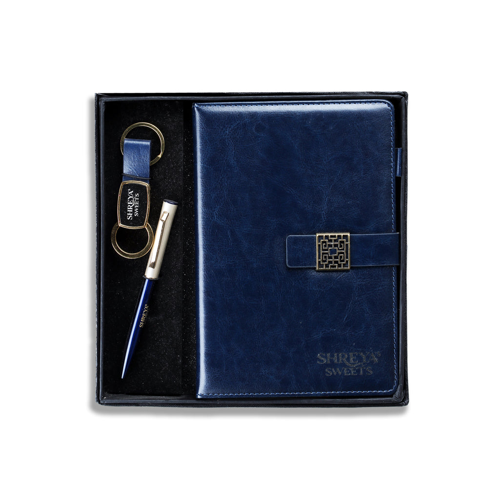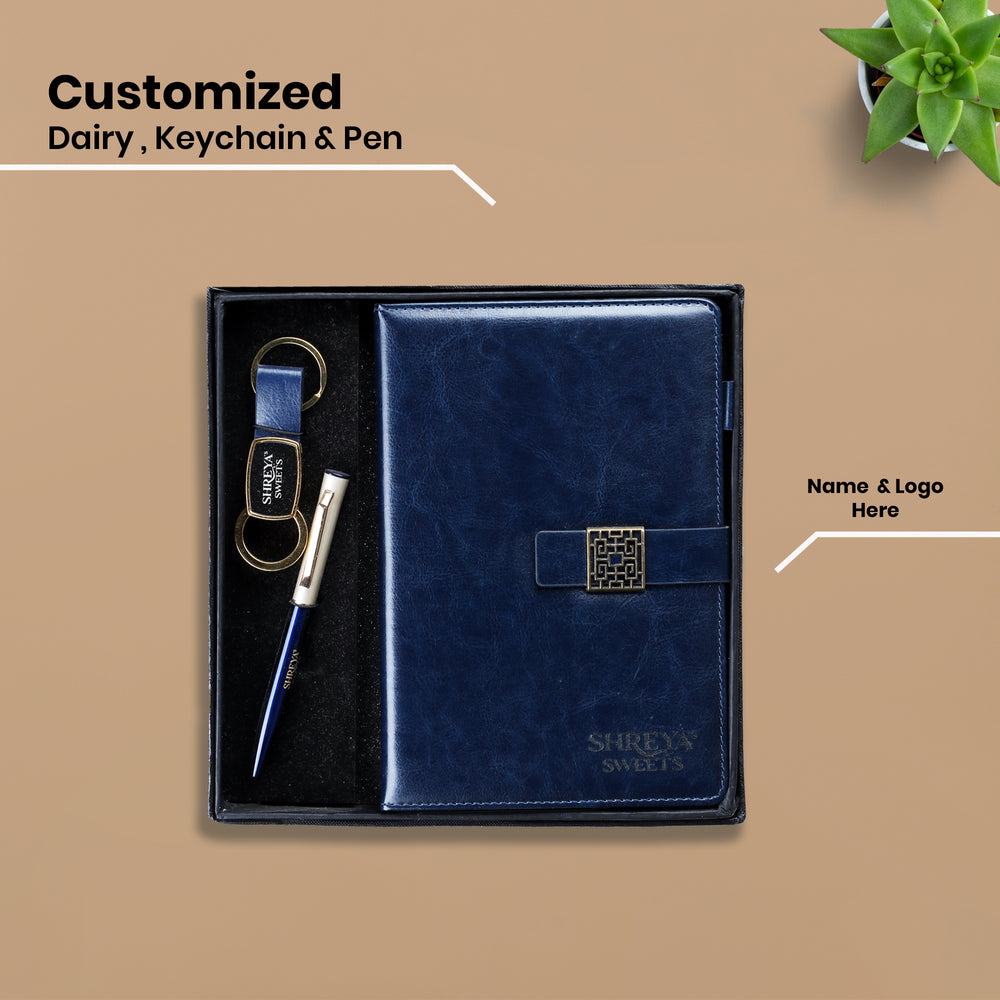 Maximize your brand's presence with the ultimate gesture of appreciation: the Diraprints Premium 3-in-1 Executive Gift Set. Featuring a rich navy blue leatherette diary, a stylish coordinating pen, and a practical branded keychain, this set provides triple the impact. Elegantly presented and designed for extensive custom logo branding, this is the definitive choice for client thank-yous, employee milestones, or high-end corporate welcome kits.